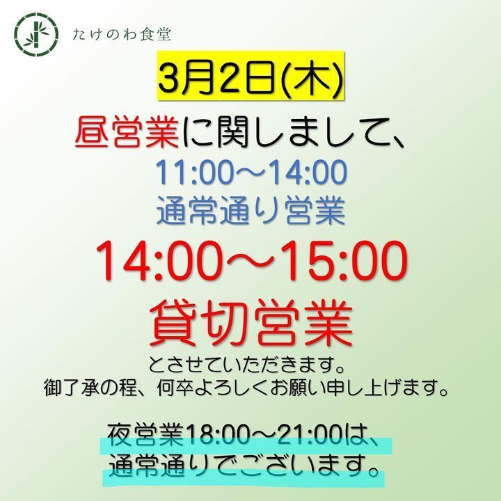 ランチ終了一時間前の14:00からの貸切営業の形となります。11:00〜14:00は通常通り営業させていただきます!