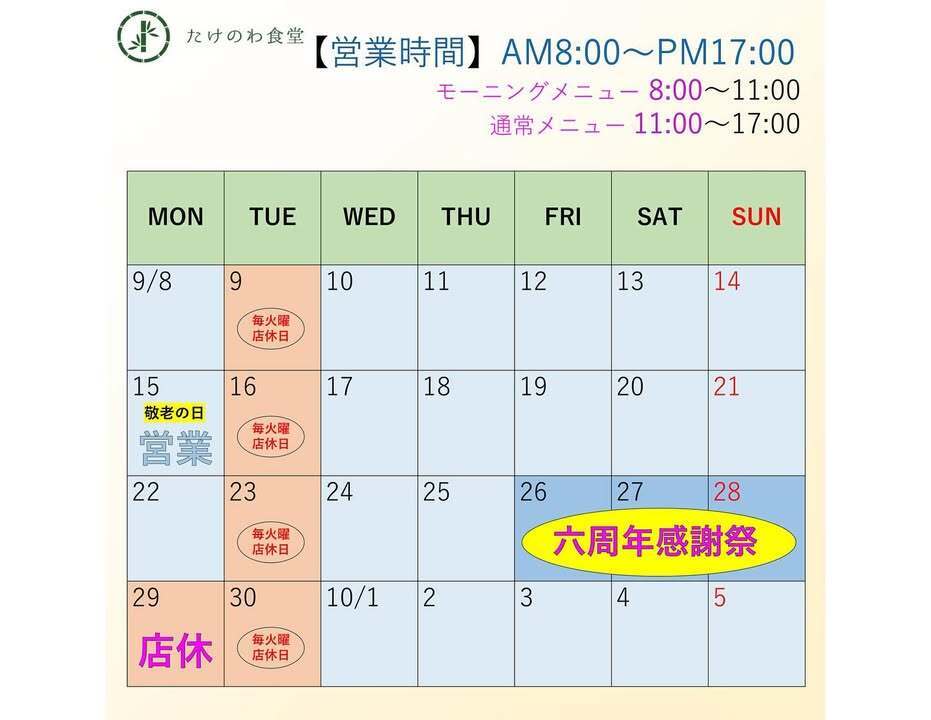 2019年09月25日グランドオープンした「たけのわ食堂」も六周年を迎えて、七年目に入ります!今後とも捨て永く宜しく御贔屓(ひいき)のほどお願い申し上げます!